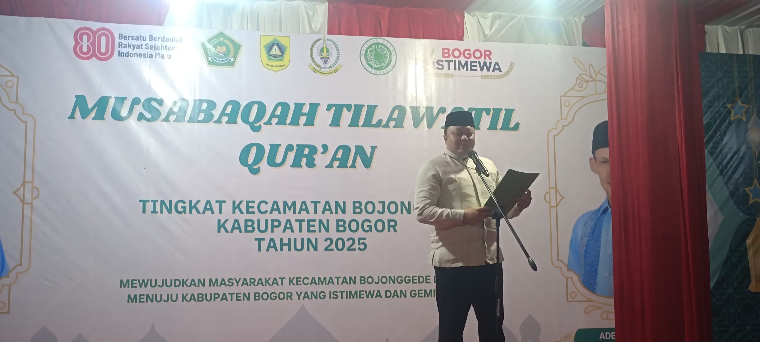 KAB.BOGOR, Kecamatan Bojonggede mengadakan Musabaqah Tilawatil Qur’an (MTQ) Ke-47. Dengan mengusung tema “Mewujudkan Masyarakat Kecamatan Bojongggede Islami Menuju Kabupaten Bogor Yang Istimewa Dan Gemilang”. Dihadiri oleh Camat Bojonggede Tenny Ramdhani, Sekretaris Camat Bojonggede, Babinsa Bojonggede, Ketua MUI Bojonggede, Kepala KUA Bojonggede, Koordinator Dewan Hakim, Ketua dan pengurus IPTQ Kec.Bojonggede, Para guru, Para Asatid, Para Asatizah, Para Sesepuh dan seluruh masyarakat Bojonggede khususnya. Diselenggarajan di Kantor Kecamatan Bojonggede. Kamis (31/07/2025) Malam.