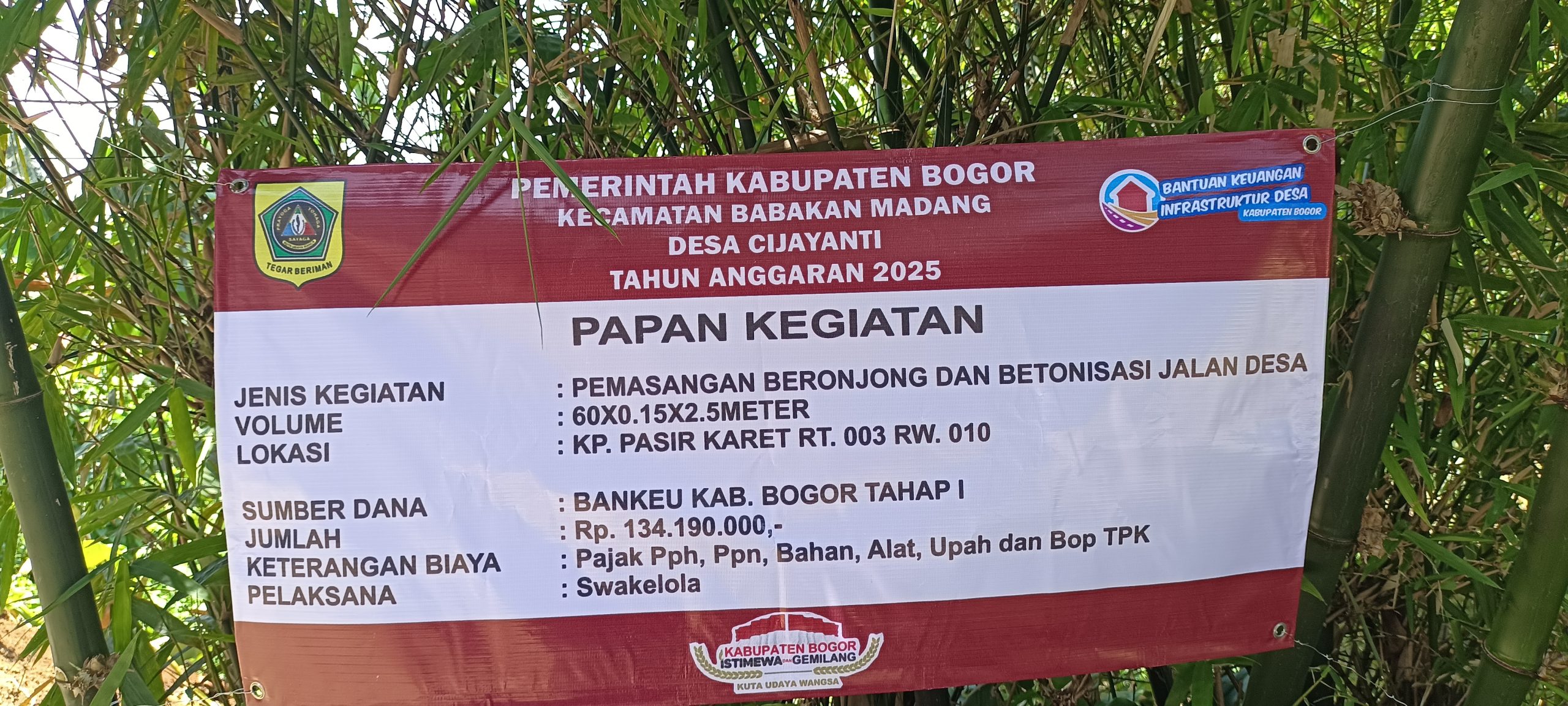 Menurut Kades Cijayanti H.Ahmad Paojan, S.Kep saat diwawancarai Awak Media mengatakan bahwa, “Pemasangan beronjong dan betonisasi jalan desa dengan volume : 60 X 0.15 X 2.5 Meter. Lokasi : Kp.Pasir Karet RT 003 RW 010, dengan total anggaran sebesar Rp.134.190.000 untuk tahap satu,” ucapnya.