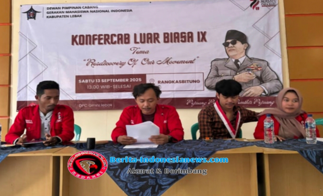 LEBAK BANTEN, Dinamika internal organisasi Gerakan Mahasiswa Nasional Indonesia (GMNI) Cabang Lebak mencapai titik krusial. Melalui Konferensi Cabang Luar Biasa (Konfercablub) yang digelar pada Minggu (14/09/2025), empat komisariat definitif GMNI di Kabupaten Lebak sepakat menurunkan Ruswana dari jabatannya sebagai Ketua DPC GMNI Lebak.
