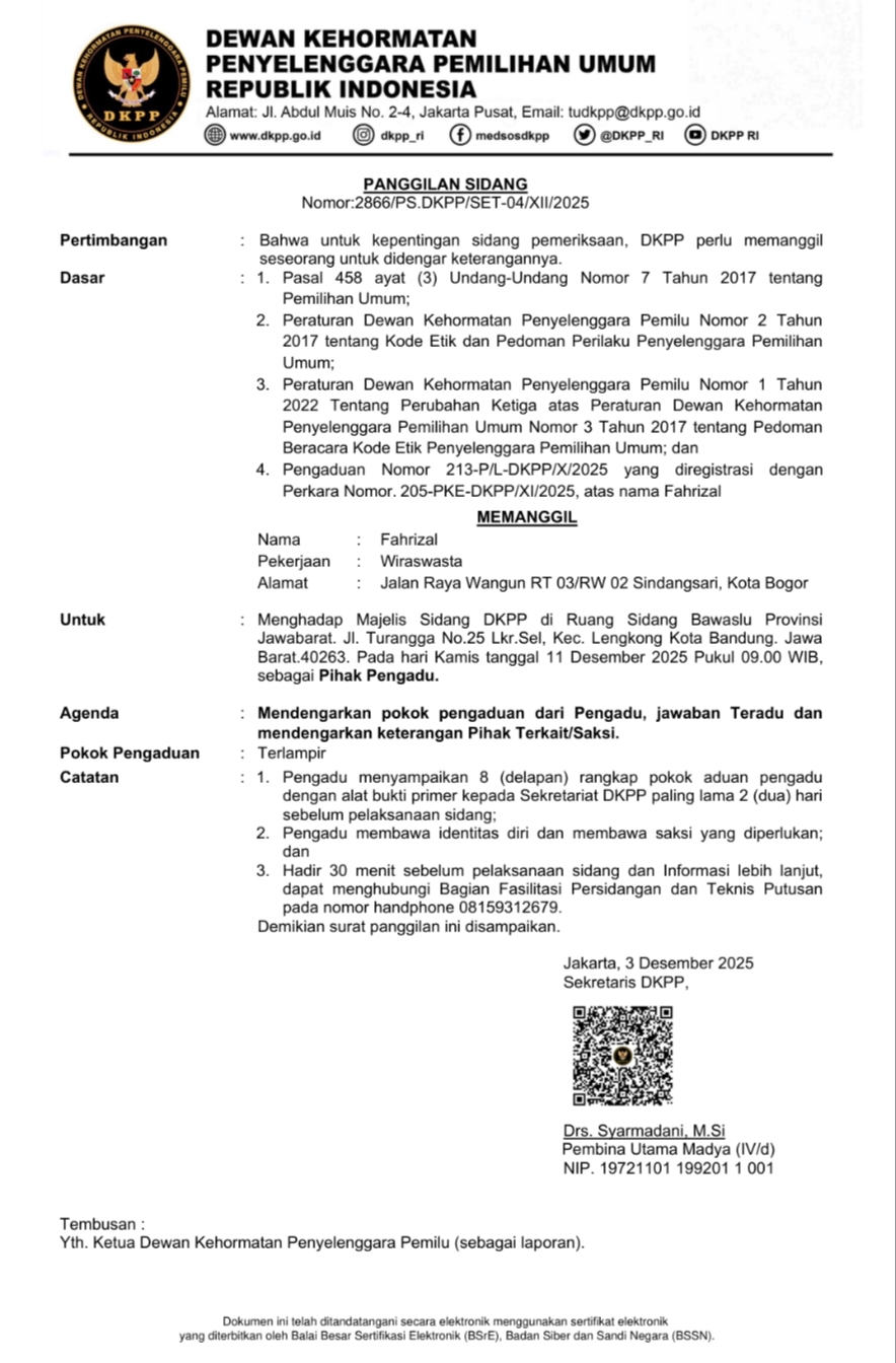 BOGOR, Dewan Kehormatan Penyelenggara Pemilu (DKPP) akan memeriksa Ketua KPU Kota Bogor dalam sidang pemeriksaan dugaan pelanggaran Kode Etik Penyelenggara Pemilu (KEPP) untuk perkara 213-p/l/-DKPP/x/2025 yang akan digelar di Kantor Bawaslu Jawa Barat, pada Kamis (11/12/2025).