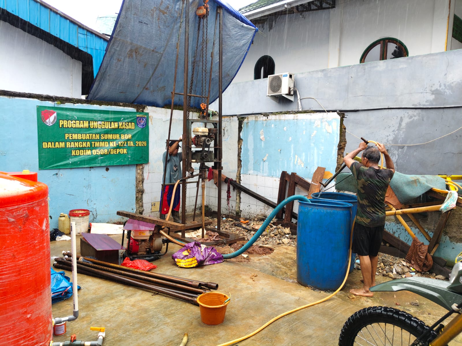 Untuk pembuatan Sumur Bor II yang berlokasi di Masjid Jami Al Mujahidin, Jalan H. Imun Raya RT 03 RW 24, Kelurahan Sukamaju, Kecamatan Cilodong, progres pengerjaan telah mencapai sekitar 67 persen.